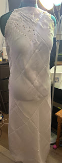 Last week was week 7, and I spent the week draping my bias-cut mach-up fabric on the form, which I then marked the seams, waist, front and back, hem, and neckline. I then took it off of the form so I could create a paper pattern for it.